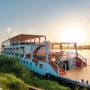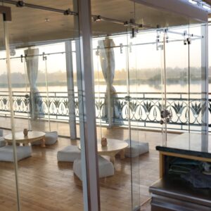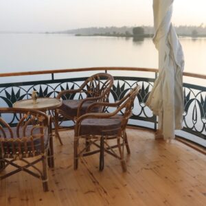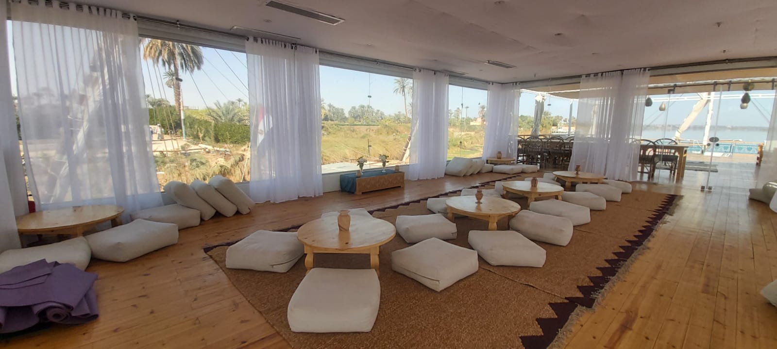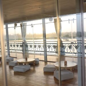 If things couldn’t get any better the top deck is the spacious sundeck, there you will find sunbeds and seating areas to enjoy the sun or relax in the shade. Buffet dining area with views of the Nile at sunset and sunrise that takes your breath away. The pièce de résistanceis our Aquarium room, this room is fully glassed so you can feel outside but inside this room is set up for meditation, yoga and workshops or the dining area with the weather being cold and windy.