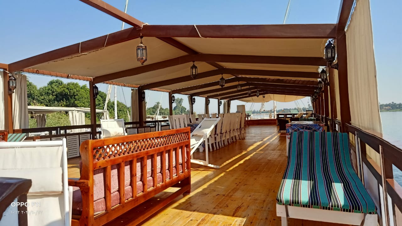 On board, the spacious upper deck provides different seating areas to relax, whether it is to sunbathe on the sun beds or sit in the shade you will experience the Nile and its tranquil scenery and the village life of Egypt pass by in perfect peace. Imagine sitting on the deck and enjoying the amazing views in wonderful tranquil silence and seeing the many ancient Egyptian monuments, temples, tombs and scenes beside the Nile that have not changed in thousands of years.